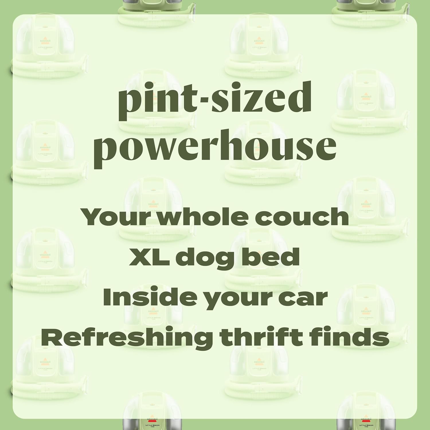The BISSELL Little Green Mini Portable Carpet and Upholstery Deep Cleaner is your go-to solution for quickly tackling pet stains, spills, and everyday messes on carpets, upholstery, car interiors, and more. Backed by the trusted BISSELL brand, this powerful compact cleaner includes a 4” Tough Stain Tool, HydroRinse self-cleaning hose, and a stain-fighting formula to permanently eliminate stains and odors. Its easy storage design fits into small spaces, while every purchase supports the BISSELL Pet Foundation's mission to save pets. Effectively clean your sanctuary and support a great cause with this versatile, portable powerhouse.