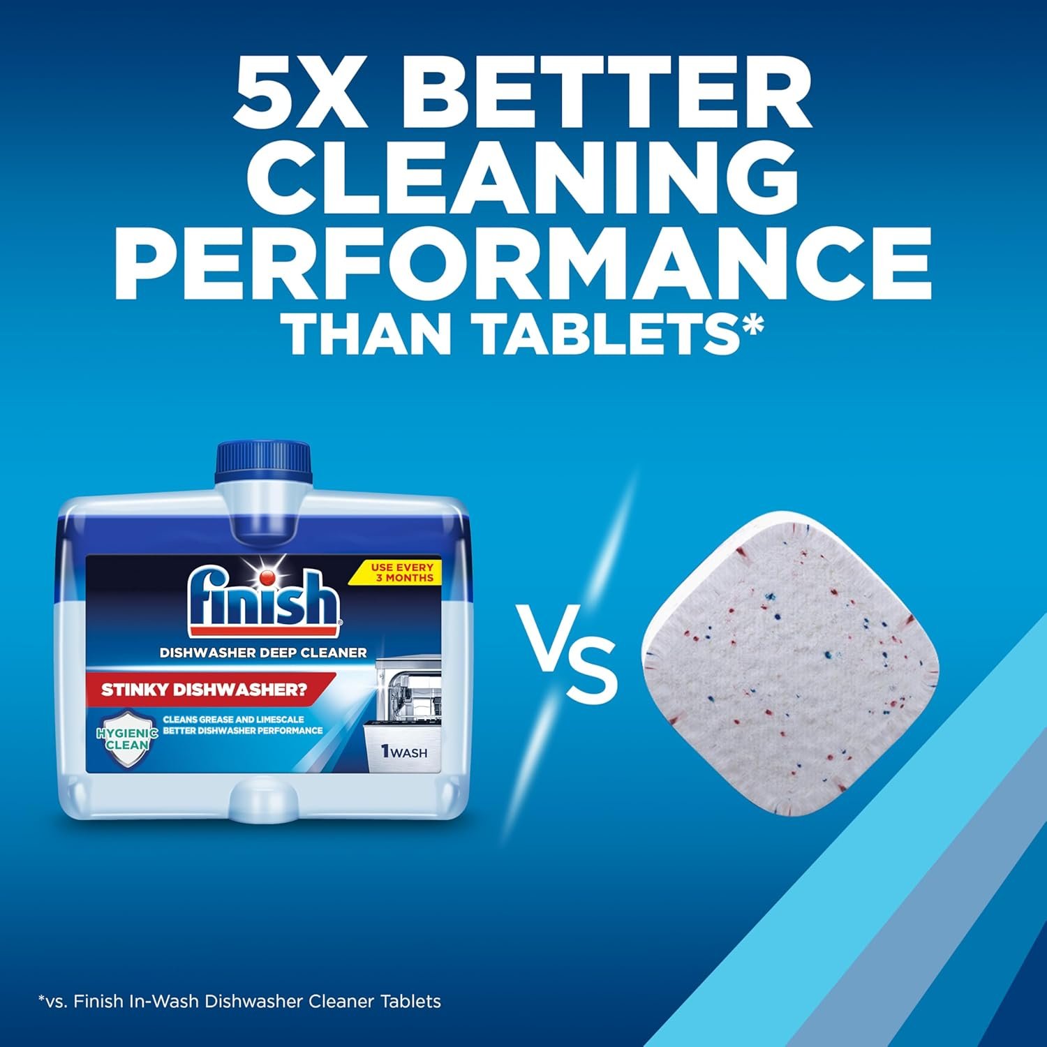 Keep your dishwasher running at its best with Finish Dishwasher Cleaner Liquid from the trusted Finish brand. This powerful cleaner deeply removes hidden grease, hardwater buildups, and limescale in hard-to-reach parts, while fighting odors for a fresher, more hygienic machine. With 5X more cleaning performance than tablets, it's easy to use and helps maintain top dishwasher performance with a simple cleaning every three months. Perfect for all types of dishwashers, Finish Dishwasher Cleaner makes it effortless to maintain both your appliance and spotless dishes.